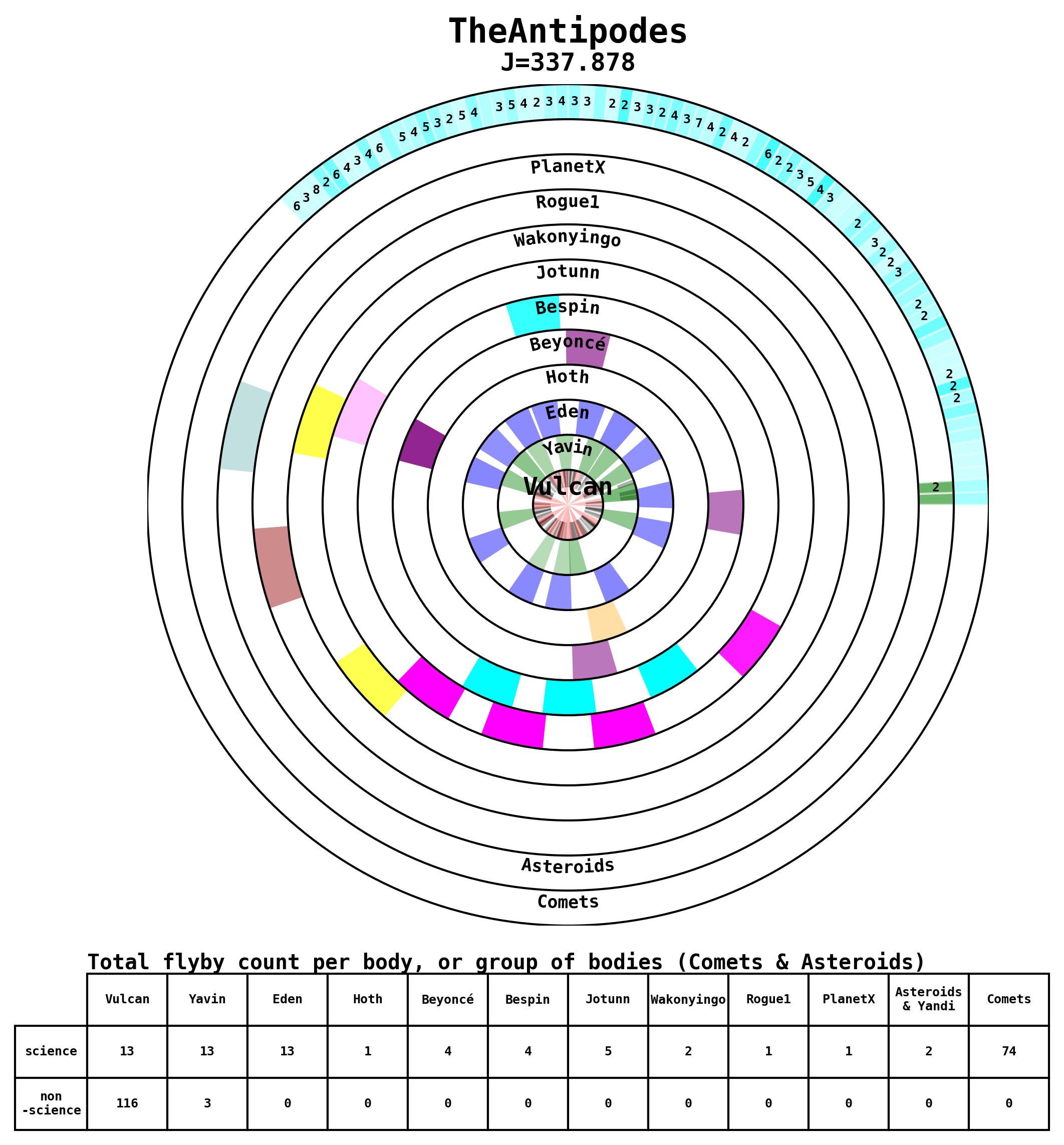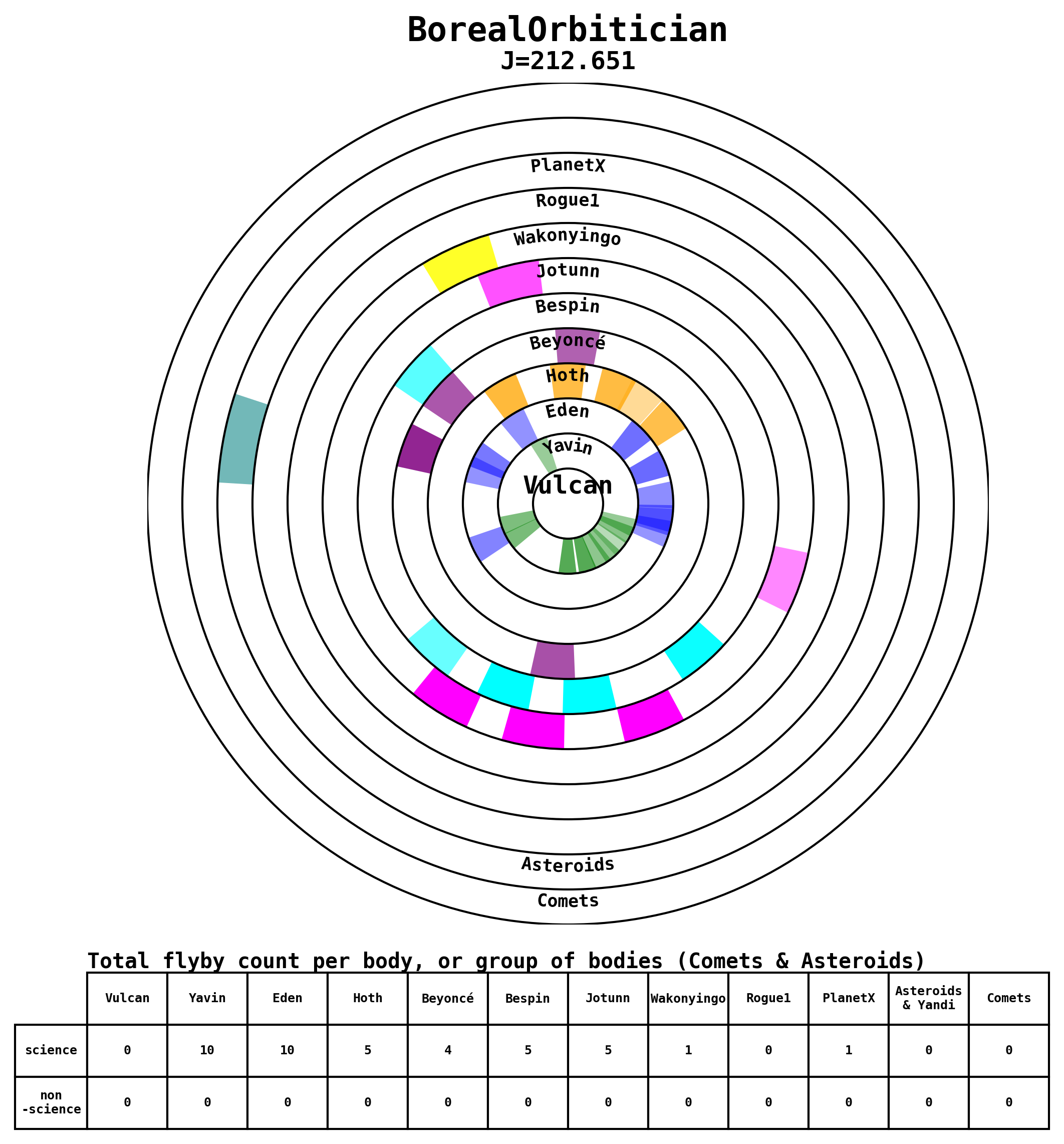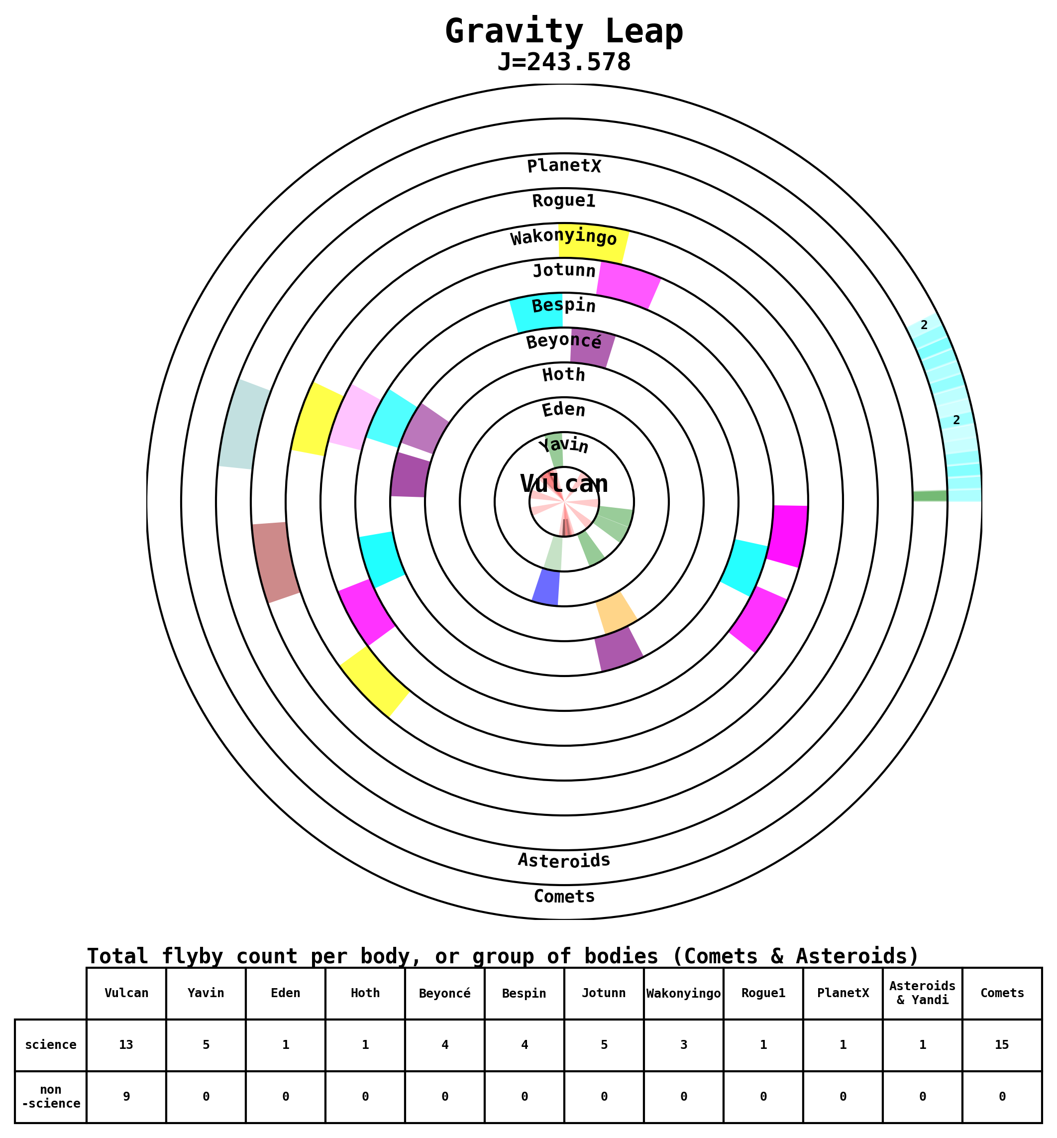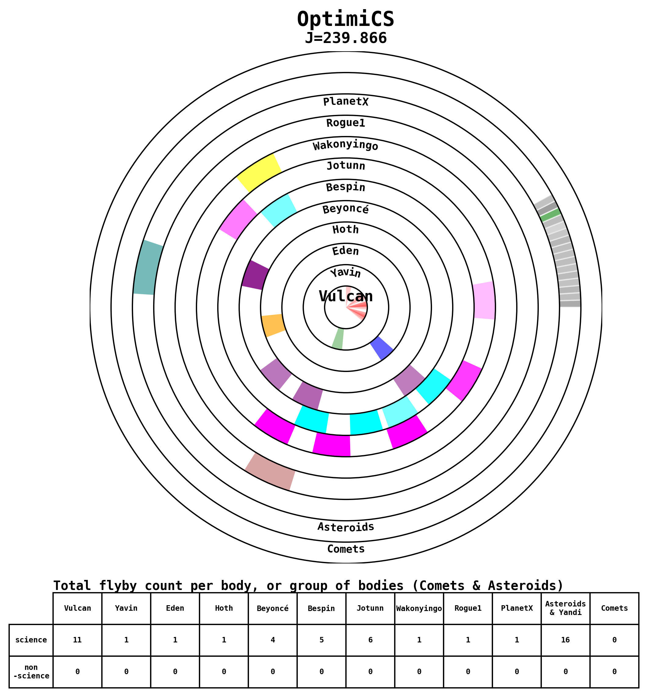 Here are some visual representations of the top 13 (J>200) trajectories submitted to the competition. Similar plots can be generated upon request for other files.